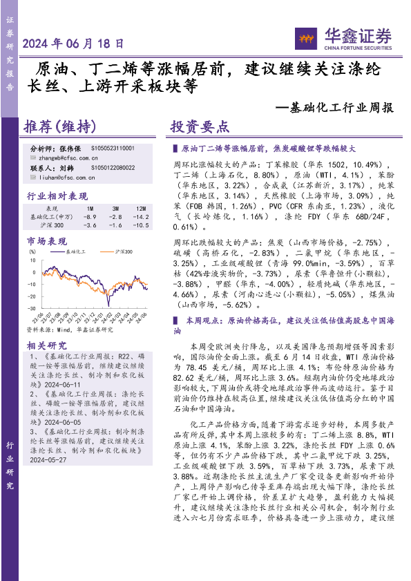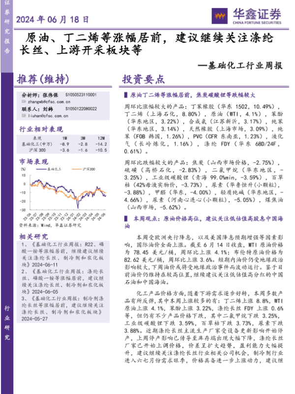 【华鑫证券】【20240618】20240618-华鑫证券-基础化工行业周报:原油、丁二烯等涨幅居前,建议继续关注涤纶长丝、上游开采板块等-30页