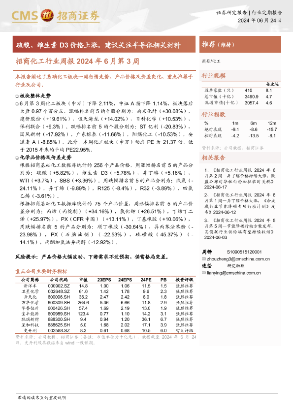 【海通证券】【20240624】招商化工行业周报2024年6月第3周:硫酸、维生素D3价格上涨,建议关注半导体相关材料-25页
