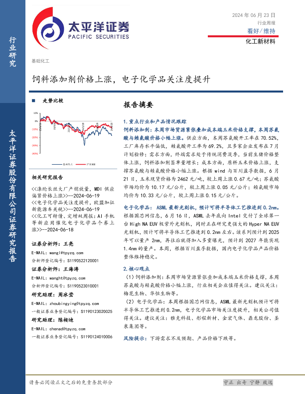 【太平洋证券】【20240623】20240623-太平洋-化工新材料行业周报:饲料添加剂价格上涨,电子化学品关注度提升-27页