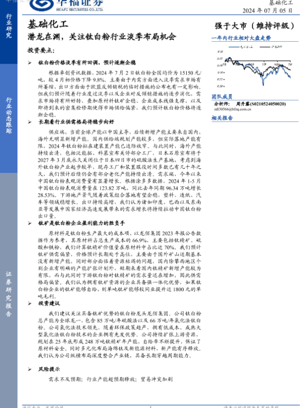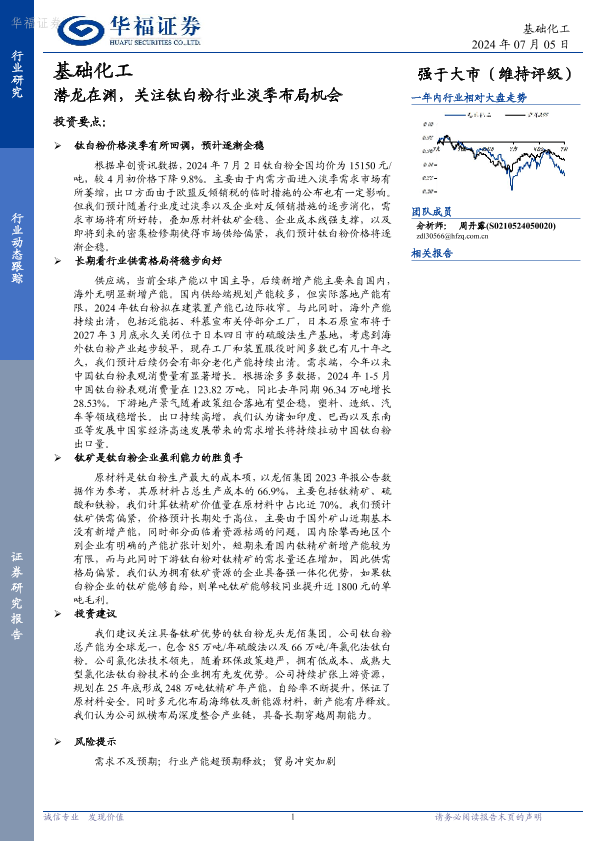 【华福证券】【20240705】基础化工:潜龙在渊,关注钛白粉行业淡季布局机会-11页
