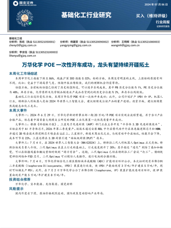 【国金证券】【20240706】基础化工行业研究:万华化学POE一次性开车成功,龙头有望持续开疆拓土-24页