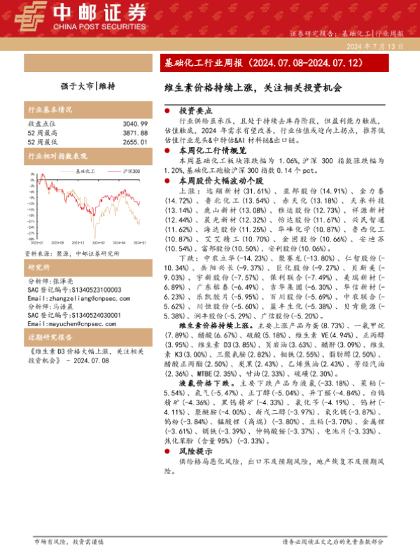 【中邮证券】【20240713】20240713-中邮证券-基础化工行业周报:维生素价格持续上涨,关注相关投资机会-15页