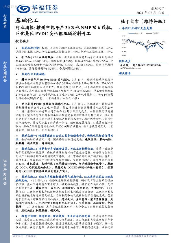 【华福证券】【20240713】基础化工行业周报:赣州中能年产30万吨NMP项目获批,巨化集团PVDC高性能阻隔材料开工-23页
