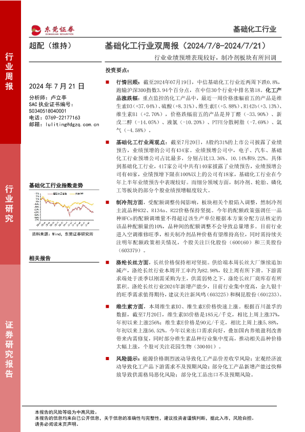 【东莞证券】【20240721】基础化工行业双周报:行业业绩预增表现较好,制冷剂板块有所回调-12页