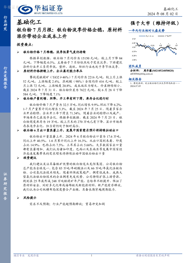 【华福证券】【20240802】基础化工钛白粉7月月报:钛白粉淡季价格企稳,原材料涨价带动企业成本上升-10页