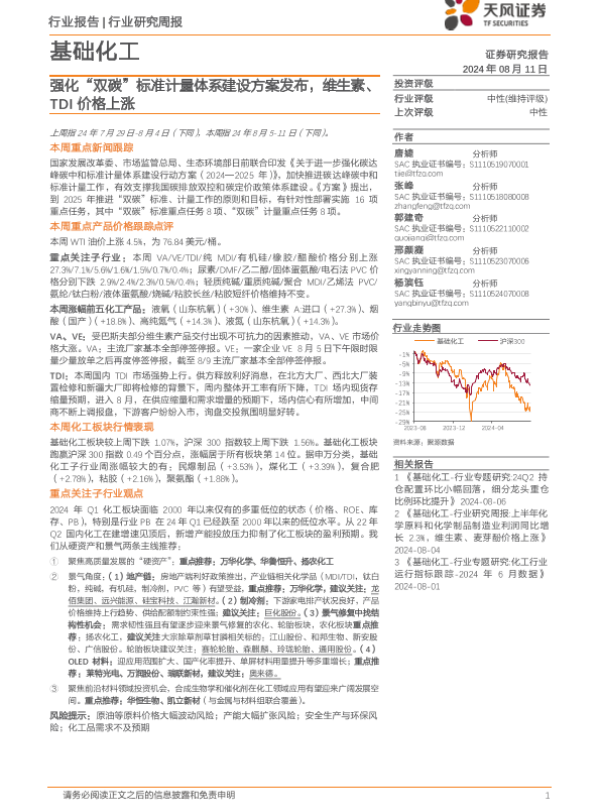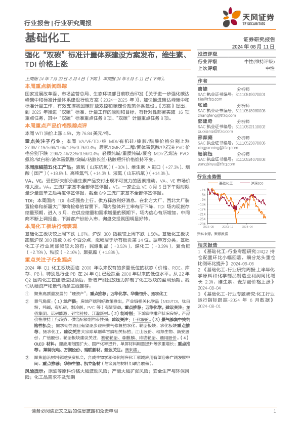【天风证券】【20240811】20240811-天风证券-基础化工行业研究周报:强化“双碳”标准计量体系建设方案发布,维生素、TDI价格上涨-20页