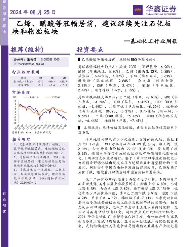 【华鑫证券】【20240825】20240825-华鑫证券-基础化工行业周报:乙烯、醋酸等涨幅居前,建议继续关注石化板块和轮胎板块-30页