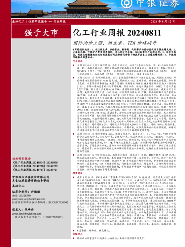 【中银证券】【20240812】20240812-中银证券-化工行业周报:国际油价上涨,维生素、TDI价格提升-15页
