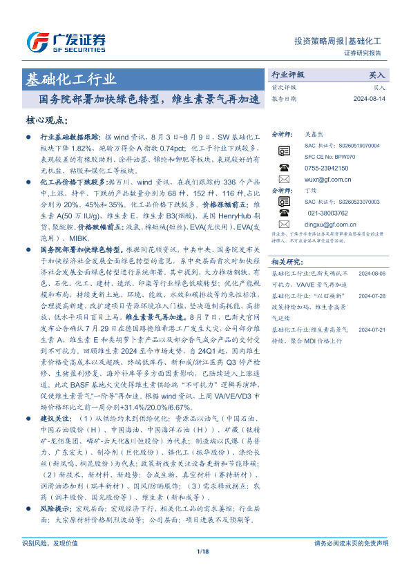【广发证券】【20240814】20240814-广发证券-基础化工行业投资策略周报:国务院部署加快绿色转型,维生素景气再加速-18页