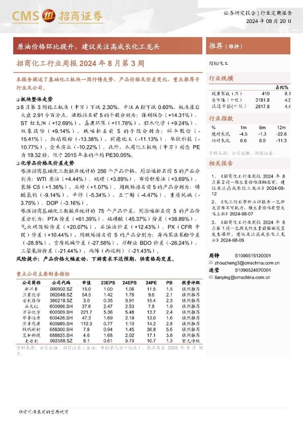 【海通证券】【20240820】2024年8月第3周:原油价格环比提升,建议关注高成长化工龙头-26页