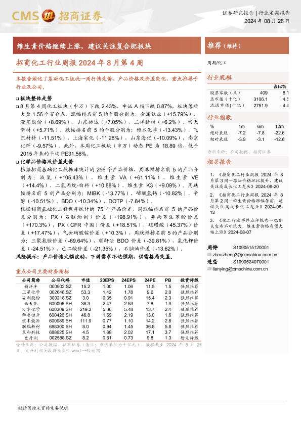 【海通证券】【20240826】招商化工行业周报2024年8月第4周:维生素价格继续上涨,建议关注复合肥板块-26页