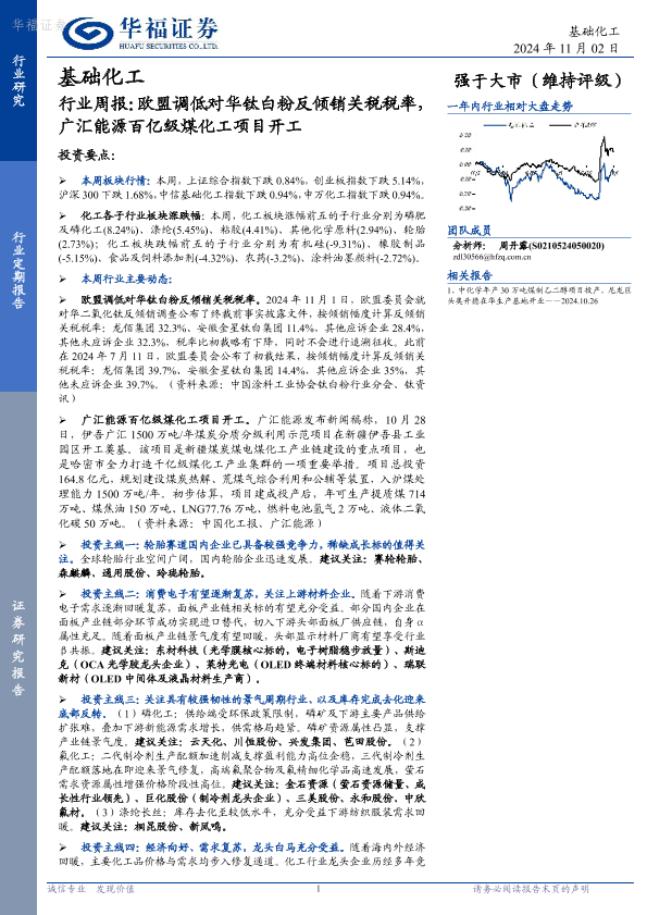【华福证券】【20241102】基础化工行业周报:欧盟调低对华钛白粉反倾销关税税率,广汇能源百亿级煤化工项目开工-22页