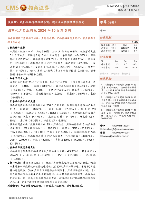 【海通证券】【20241104】招商化工行业周报2024年10月第5周:氢氟酸、氯化亚砜价格涨幅居前,建议关注低估值绩优标的-16页