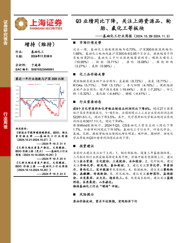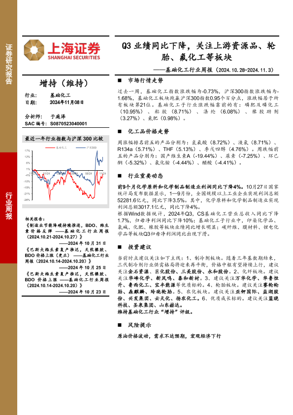 【上海证券】【20241108】20241108-上海证券-基础化工行业周报:Q3业绩同比下降,关注上游资源品、轮胎、氟化工等板块-11页
