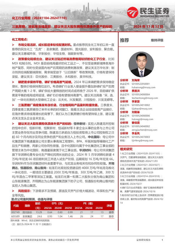 【民生证券】【20241112】20241112-民生证券-化工行业周报:三氯蔗糖、液氯等涨幅靠前,建议关注大股东拥有优质体外资产的标的-32页