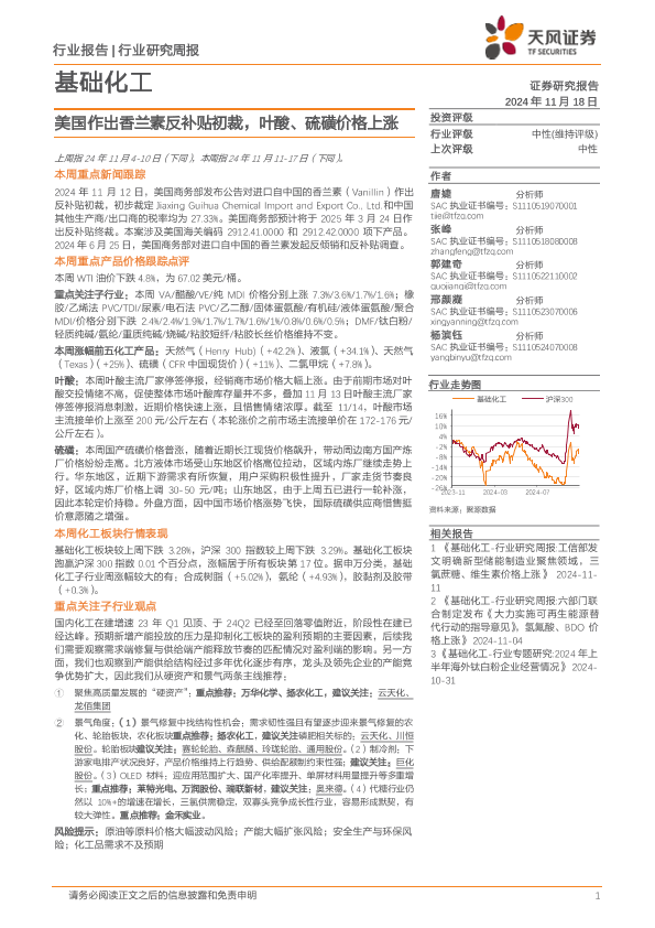 【天风证券】【20241118】20241118-天风证券-基础化工行业研究周报:美国作出香兰素反补贴初裁,叶酸、硫磺价格上涨-20页