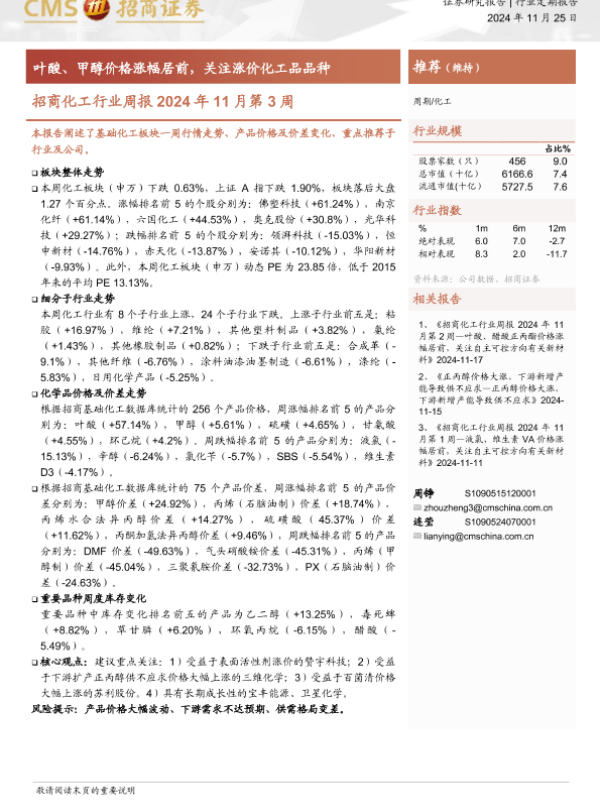 【海通证券】【20241125】招商化工行业周报2024年11月第3周:叶酸、甲醇价格涨幅居前,关注涨价化工品品种-15页