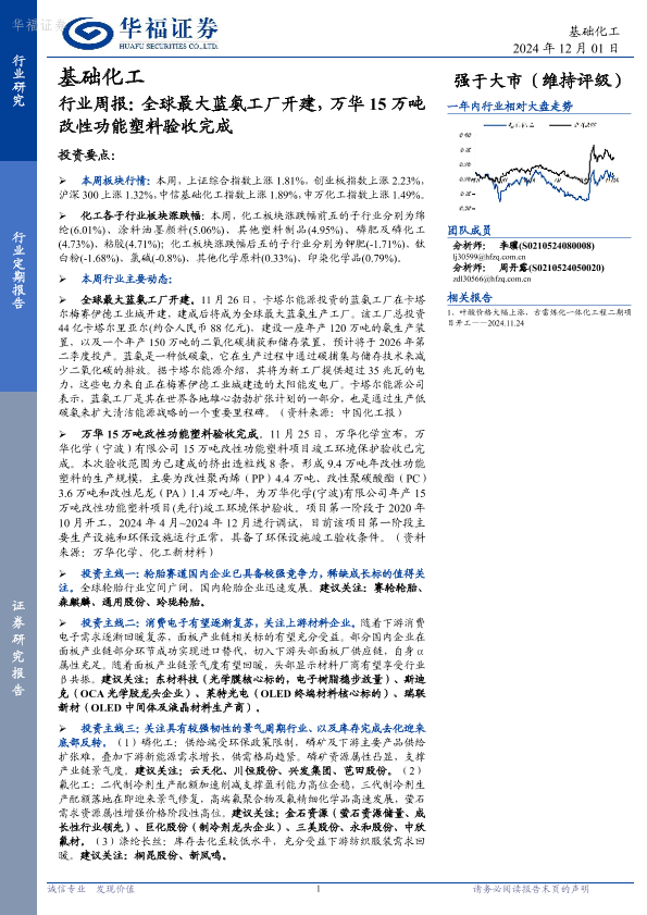【华福证券】【20241201】基础化工行业周报:全球最大蓝氨工厂开建,万华15万吨改性功能塑料验收完成-22页