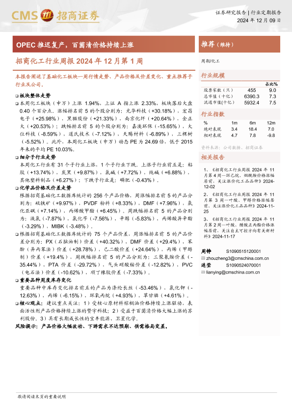 【海通证券】【20241209】招商化工行业周报2024年12月第1周:OPEC推迟复产,百菌清价格持续上涨-15页