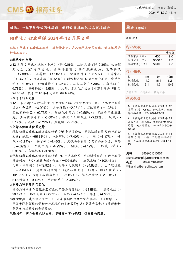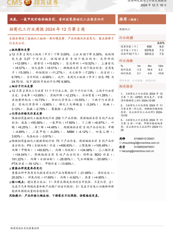 【海通证券】【20241216】招商化工行业周报2024年12月第2周:液氯、一氯甲烷价格涨幅居前,看好政策推动化工品需求回升-15页