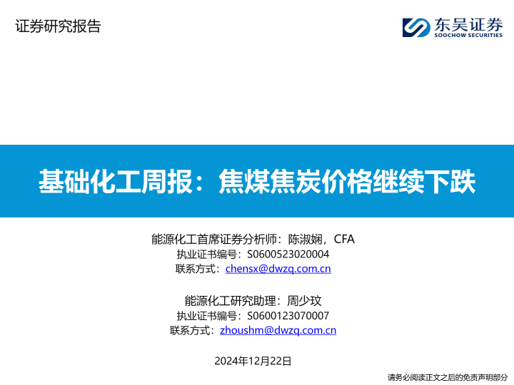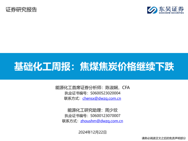 【东吴证券】【20241222】基础化工周报:焦煤焦炭价格继续下跌-18页
