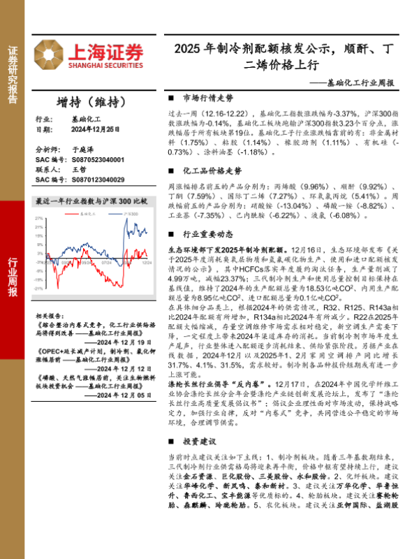 【上海证券】【20241225】20241225-上海证券-基础化工行业周报:2025年制冷剂配额核发公示,顺酐、丁二烯价格上行-10页