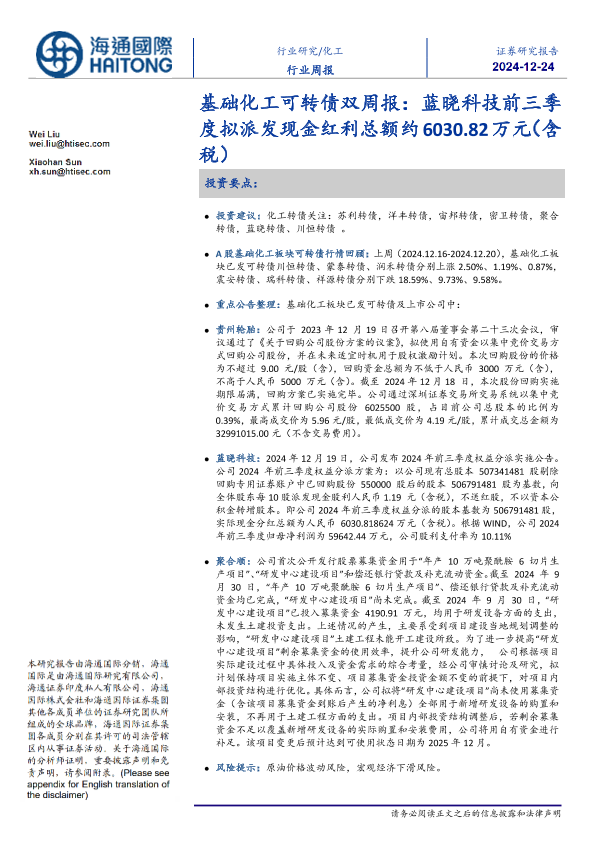 【海通国际】【20241224】基础化工可转债双周报:蓝晓科技前三季度拟派发现金红利总额约6030.82万元(含税)-21页