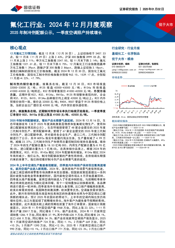 【国信证券】【20250102】氟化工行业:2024年12月月度观察:2025年制冷剂配额公示,一季度空调排产持续增长-26页