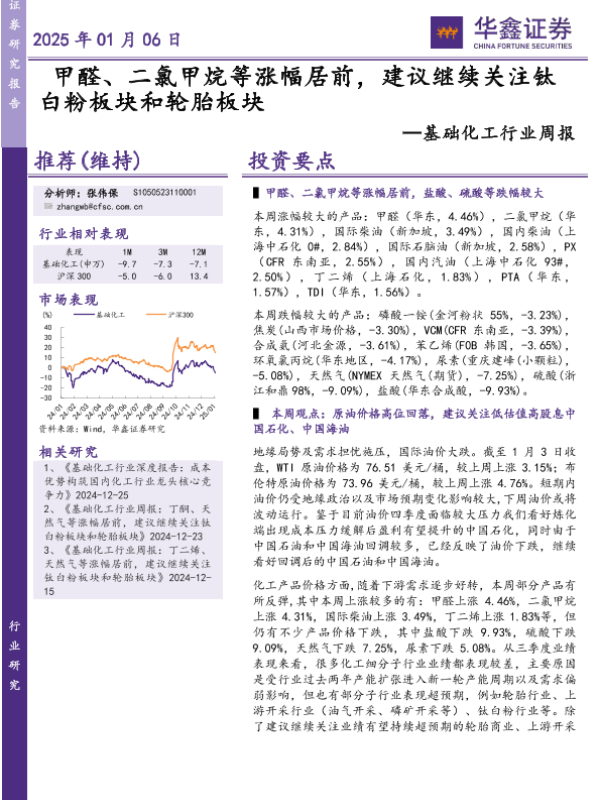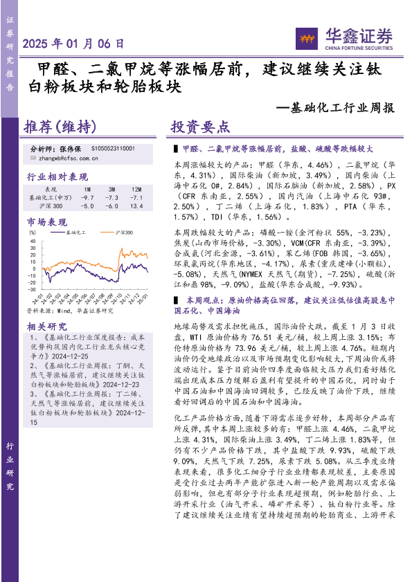 【华鑫证券】【20250106】20250106-华鑫证券-基础化工行业周报:甲醛、二氯甲烷等涨幅居前,建议继续关注钛白粉板块和轮胎板块-31页
