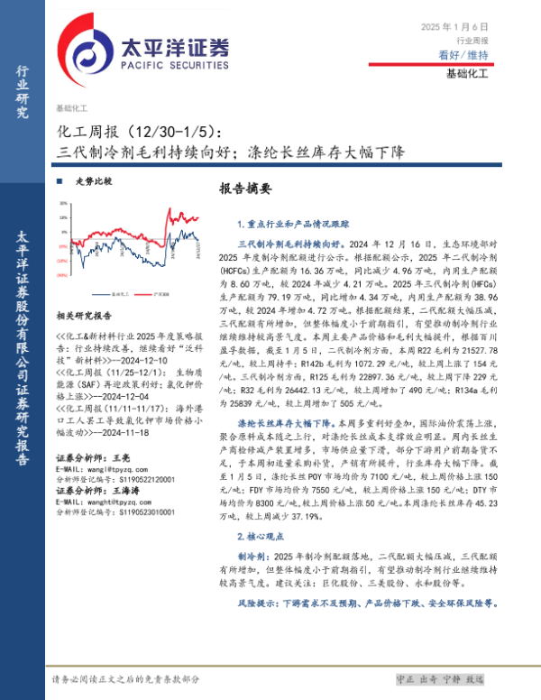 【太平洋证券】【20250106】20250106-太平洋-基础化工行业周报:三代制冷剂毛利持续向好;涤纶长丝库存大幅下降-30页