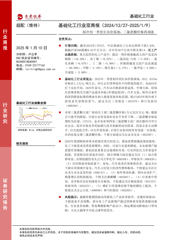 【东莞证券】【20250110】20250110-东莞证券-基础化工行业双周报:制冷剂一季度长协价落地,三氯蔗糖价格再调涨-13页