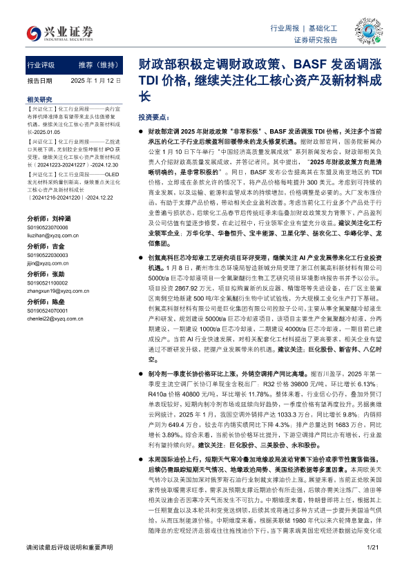 【兴业证券】【20250112】20250112-兴业证券-基础化工行业周报:财政部积极定调财政政策、BASF发函调涨TDI价格,继续关注化工核心资产及新材料成长-21页