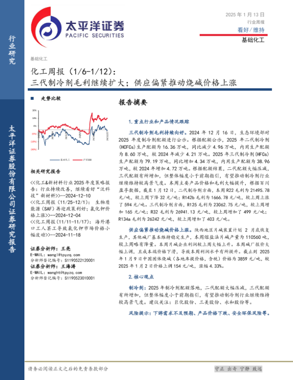 【太平洋证券】【20250113】20250113-太平洋-化工行业周报:三代制冷剂毛利继续扩大;供应偏紧推动烧碱价格上涨-31页