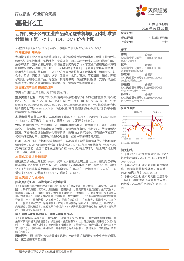 【天风证券】【20250120】基础化工行业研究周报:四部门关于公布工业产品碳足迹核算规则团体标准推荐清单(第一批),TDI、DMF价格上涨-20页