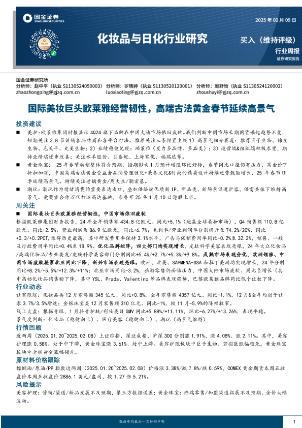 【国金证券】【20250209】20250209-国金证券-化妆品与日化行业研究:国际美妆巨头欧莱雅经营韧性,高端古法黄金春节延续高景气-10页