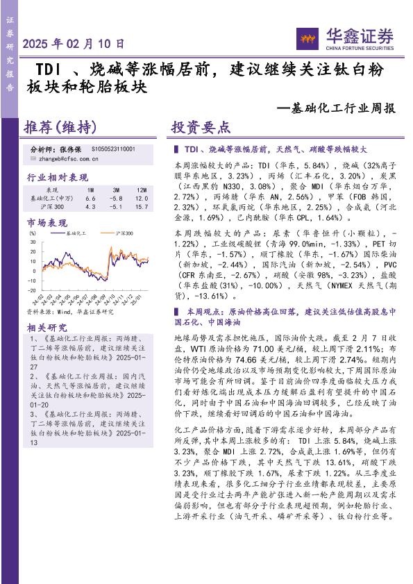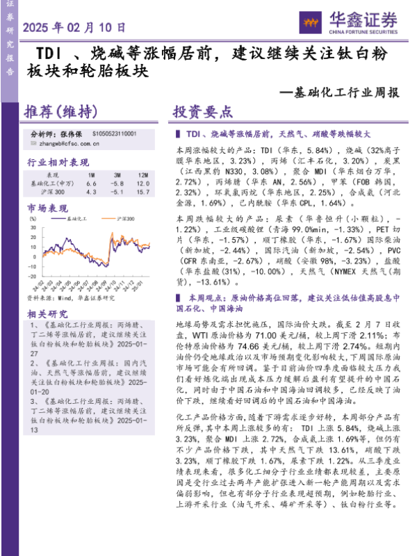 【华鑫证券】【20250210】20250210-华鑫证券-基础化工行业周报:TDI、烧碱等涨幅居前,建议继续关注钛白粉板块和轮胎板块-31页