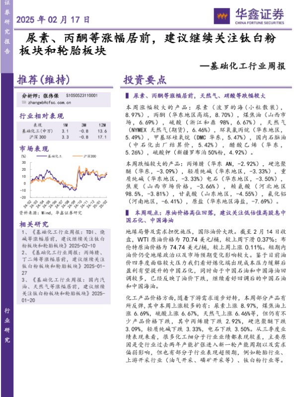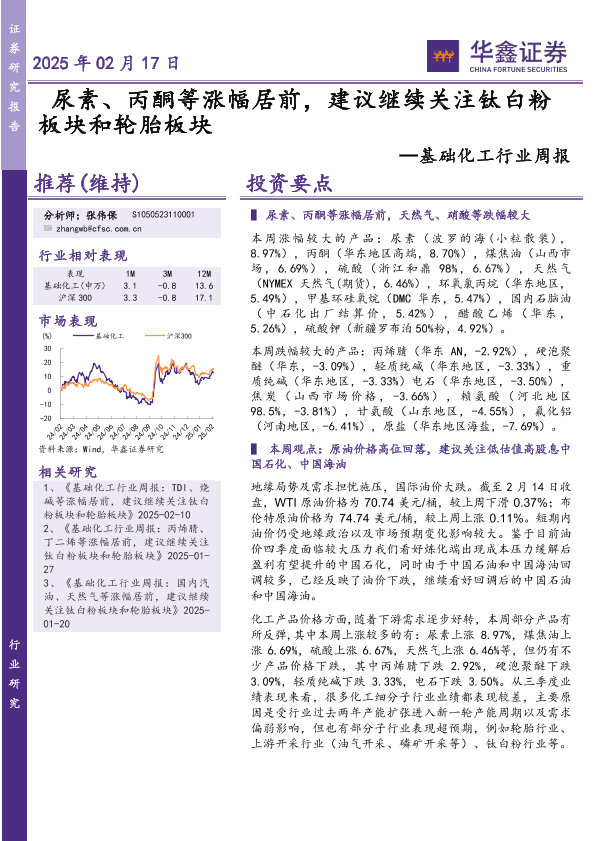 【华鑫证券】【20250217】20250217-华鑫证券-基础化工行业周报:尿素、丙酮等涨幅居前,建议继续关注钛白粉板块和轮胎板块-32页
