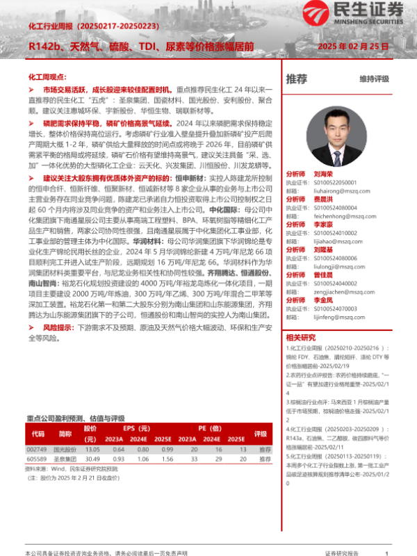 【民生证券】【20250225】20250225-民生证券-化工行业周报:R142b、天然气、硫酸、TDI、尿素等价格涨幅居前-35页