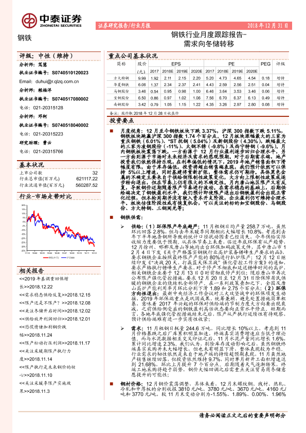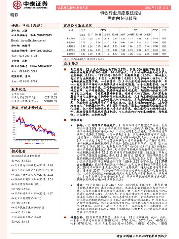 【中泰证券】【20181231】钢铁行业月度跟踪报告:需求向冬储转移-22页