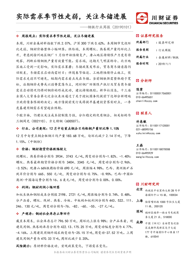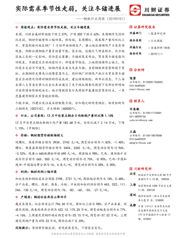 【川财证券】【20190101】20190101-川财证券-钢铁行业周报:实际需求季节性走弱,关注冬储进展-24页