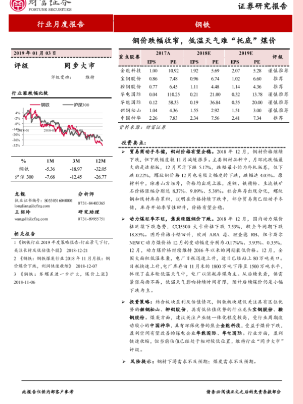 【财信证券】【20190103】钢铁行业月度报告:钢价跌幅收窄,低温天气难“托底”煤价-16页