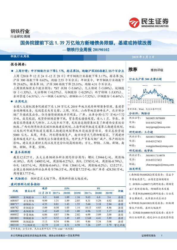 【民生证券】【20190102】国务院提前下达1.39万亿地方新增债务限额,基建或持续改善——钢铁行业周报 20190102-22页