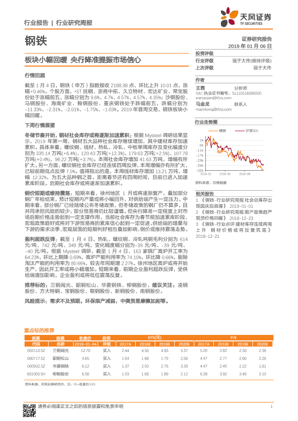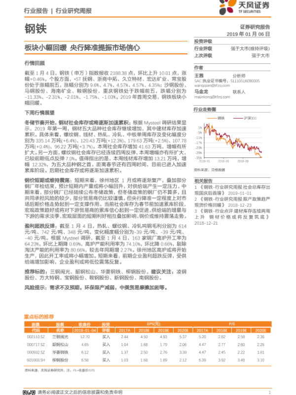 【天风证券】【20190106】钢铁行业研究周报:板块小幅回暖 央行降准提振市场信心-12页