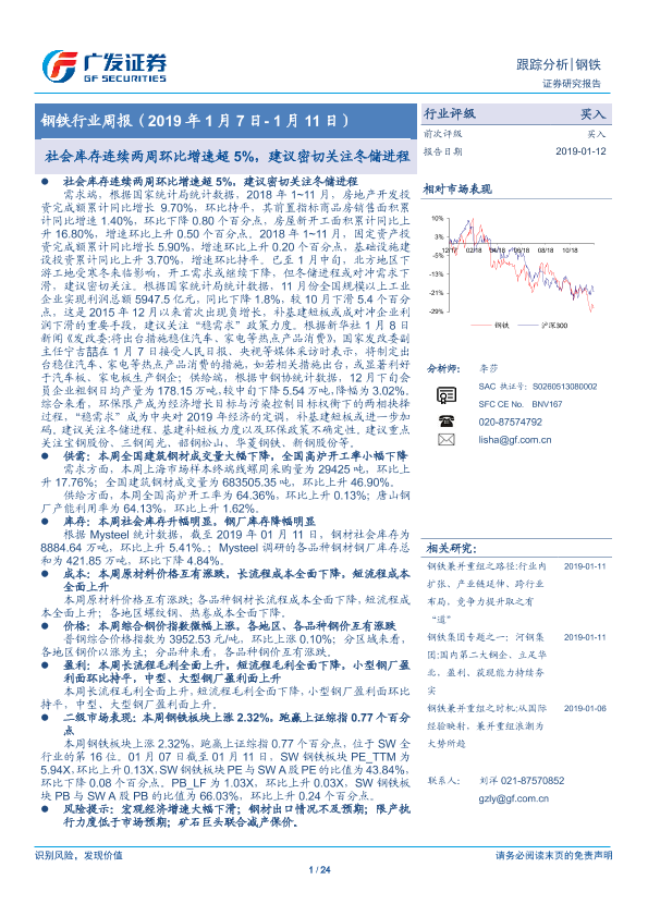 【广发证券】【20190112】20190112-广发证券-钢铁行业周报:社会库存连续两周环比增速超5%,建议密切关注冬储进程-24页