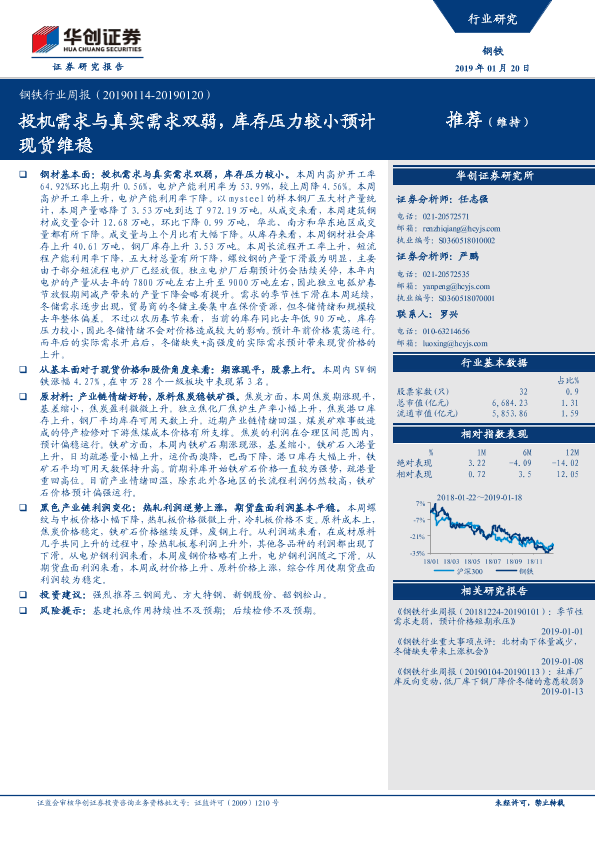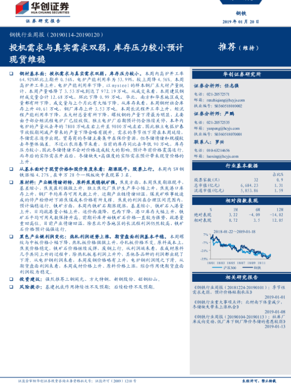【华创证券】【20190120】20190120-华创证券-钢铁行业周报:投机需求与真实需求双弱,库存压力较小预计现货维稳-24页