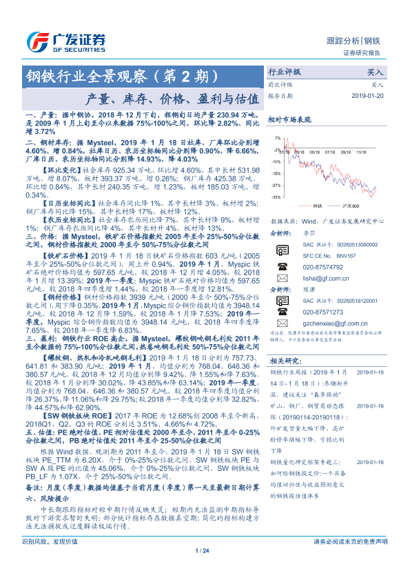 【广发证券】【20190120】20190120-广发证券-钢铁行业全景观察(第2期):产量、库存、价格、盈利与估值-24页
