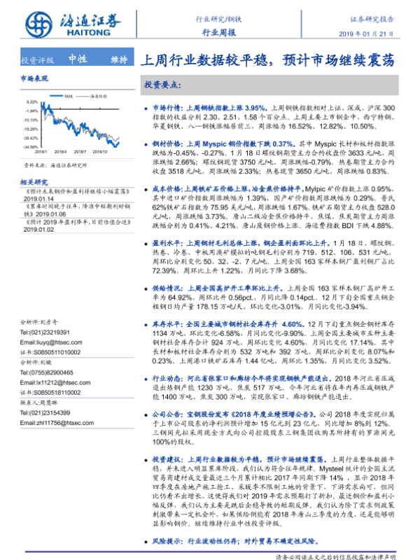 【海通证券】【20190121】20190121-海通证券-钢铁行业周报:上周行业数据较平稳,预计市场继续震荡-19页