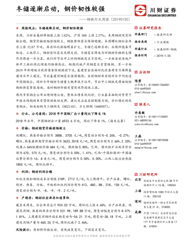 【川财证券】【20190120】20190120-川财证券-钢铁行业周报:冬储逐渐启动,钢价韧性较强-24页