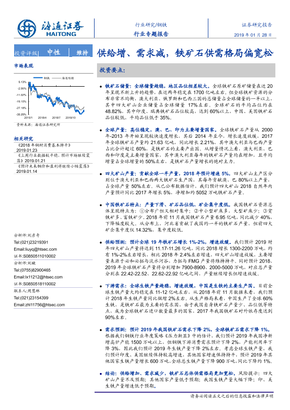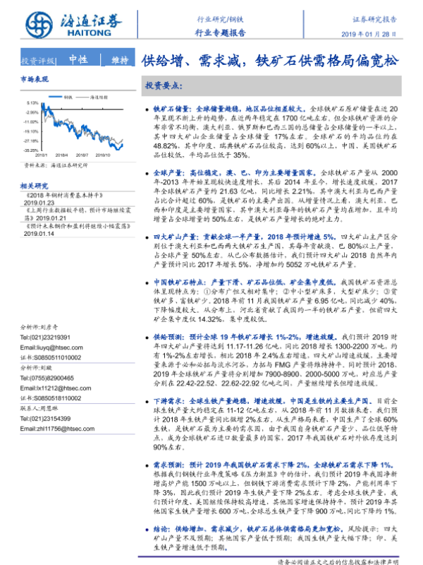【海通证券】【20190128】20190128-海通证券-钢铁行业专题报告:供给增、需求减,铁矿石供需格局偏宽松-17页