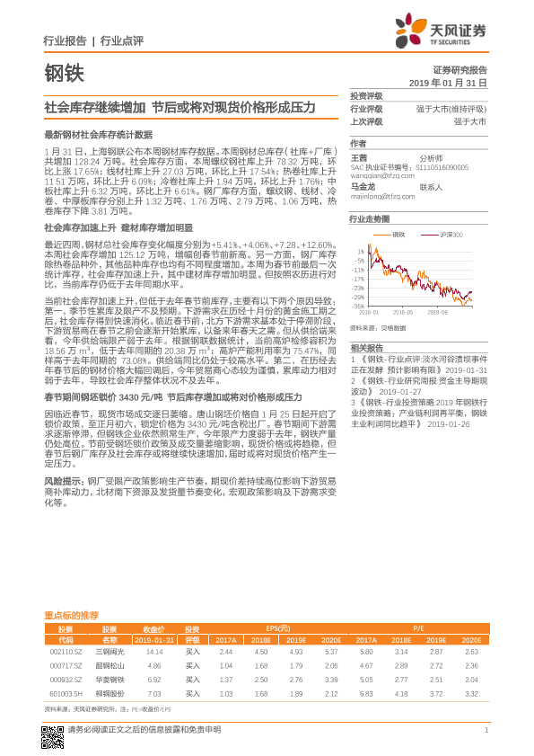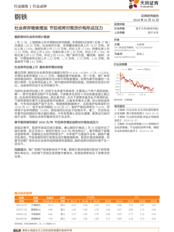 【天风证券】【20190131】钢铁行业点评:社会库存继续增加 节后或将对现货价格形成压力-2页